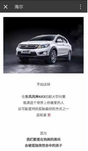 此前海爾訂閱號發布了一條消息,宣布向全世界開放廣告位,并且成立了海爾新媒體自己的廣告公司,全面的幫海爾生態圈內外的企業做社會化營銷,接著東風汽車成為了首位廣告主。