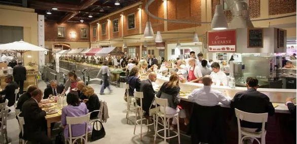 Eataly將自己定位為“慢食超市餐廳”,你會發(fā)現(xiàn)它更像是一個食品市場,這里不僅陳列著玲瑯滿目的食材,而且旁邊還有廚師、餐桌和服務(wù)生。每個陳列區(qū)旁都設(shè)有用餐處,顧客既可以選好食材回家烹飪,也可以讓廚師為你烹飪好,直接在此享用。