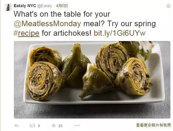 Eataly還設(shè)立不少特別的日子來宣揚慢生活的理念,通過在社交媒體平臺上的轟炸式宣傳來不斷激發(fā)人們前來的欲望。比如,每周一被Eataly定為“素食周一”(Meatless Monday)。