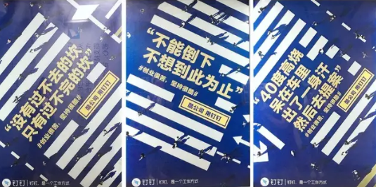 釘釘最近在地鐵投放的廣告,釘釘用一些艱苦創業的故事致敬創業者們,文案很喪,又暗戳戳地刺痛了每一位創業者的心,既然創業這么苦,為什么還要堅持呢?