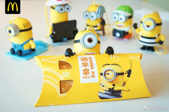 圍繞《神偷奶爸3》的場景和小黃人的形象,麥當(dāng)勞推出了小黃人系列新品,不僅包裝和名字契合小黃人主題,如“霸拿拿”香蕉派、“萌滋滋”麥趣雞盒等,就連漢堡的面包上也印有小黃人。