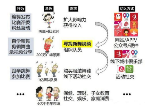 廣場舞人群主要包括明星編舞網(wǎng)紅老師,舞隊領舞和舞隊隊員,需求場景也都有很多差異。廣場舞本身也算是體育產業(yè)+文化產業(yè)+中老年互聯(lián)網(wǎng)的結合點,可選的產品形式有很多,都可以從某一點切入進行延伸擴展。