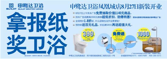 中寰創(chuàng)世(鄭州)營(yíng)銷策劃有限公司與中國(guó)名牌、中國(guó)衛(wèi)浴行業(yè)十大品牌——申鷺達(dá)衛(wèi) 浴簽署2011年度整合營(yíng)銷策劃服務(wù)協(xié)議。申鷺達(dá)是專業(yè)致力于水暖、衛(wèi)浴潔具研發(fā)與生產(chǎn)的知名企業(yè)。公司擁有4萬(wàn)多平方米的花園式廠房,年產(chǎn)1000萬(wàn)套 衛(wèi)浴產(chǎn)品,產(chǎn)品在國(guó)內(nèi)的市場(chǎng)占有率及企業(yè)的綜合實(shí)力穩(wěn)居國(guó)內(nèi)同行業(yè)前列,是國(guó)家建設(shè)部建材局衛(wèi)生潔具配件生產(chǎn)定點(diǎn)管理企業(yè)。2010年6月28日,申鷺達(dá)以17.78億元的品牌價(jià)值榮登 “中國(guó)500最具價(jià)值品牌”排行榜。