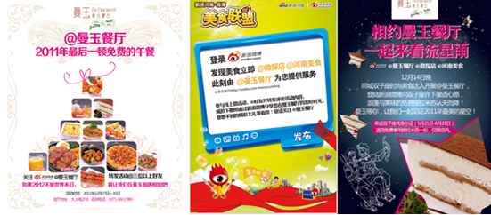 中寰創世在2010年底在河南地區開始研究并為部分企業提供互動營銷服務,此次在為曼玉餐廳的策劃中大范圍采用了互動營銷創意。12月2日媒體品鑒團、12月3日微博開業觀禮團、12月3日與“蘿卜哥”韓紅剛簽定蔬菜定向種植采購合同并支付定金,得到了人民日報、河南日報、大河報、河南商報、鄭州晚報、東方今報、大河網、河南電視臺等眾多媒體跟蹤報道,成為愛心企業的代表。隨后又陸續推出了新浪品鑒團、免費的午餐等等微博互動營銷。讓曼玉餐廳從開業到現在一直顧客盈門、好評如潮,成為鄭州地區利用網絡低成本營銷的企業標桿案例。